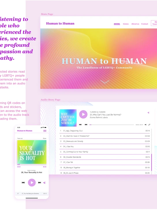 Collect personal stories from people from the LGBTQ+ community and made them into an awareness campaign including online audio website and offline postcards and stickers with QR codes.