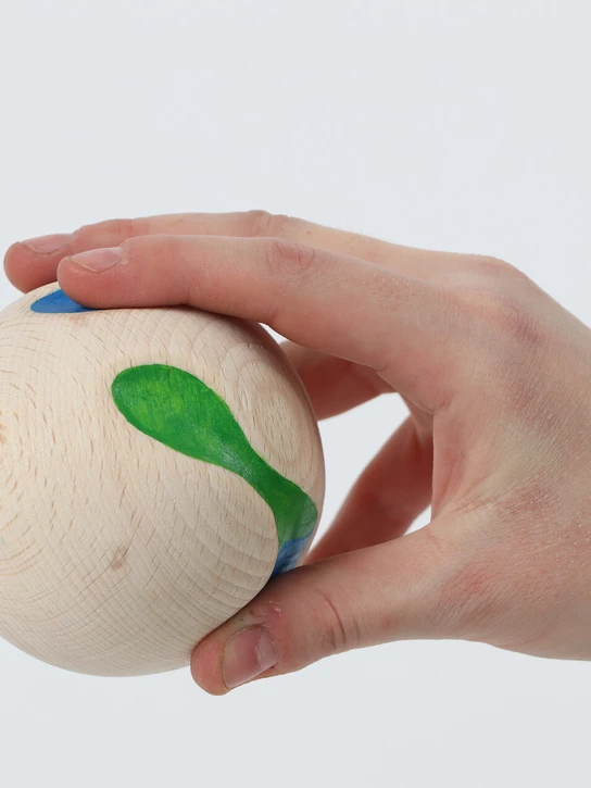 The last product focuses on the activity that can serve as an icebreaker for new members, a teaching tool for the coach, and a warm-up for the players. The ball is made of wood, a material that is slightly heavier than the boccia balls, to help the warm-up of the players on the grip. We marked and engraved the finger placement for the two main grip positions to throw the boccia balls, using the green and blue colors to highlight them.