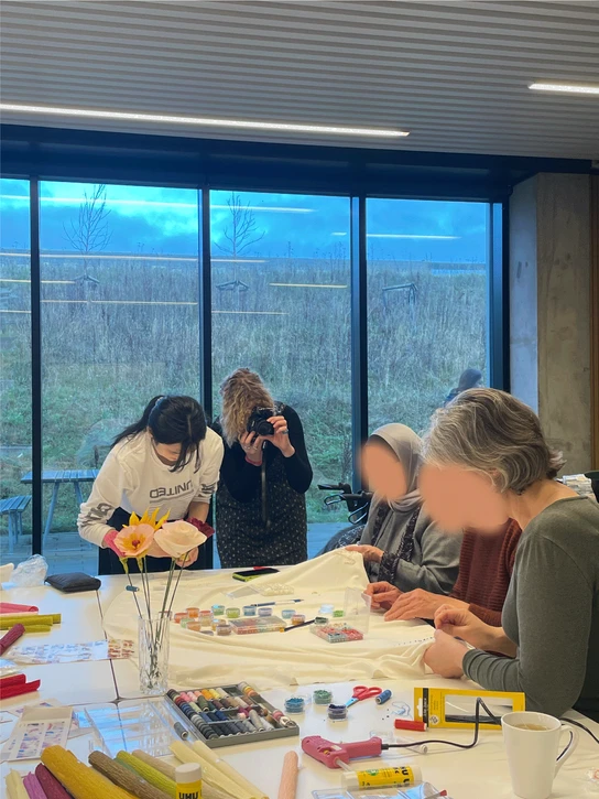 The dancing ladies, known as the Wise and Wonderful, let us into their world by engaging us in their everyday lives and activities at Fælleshuset. We decided to let them into our world, by inviting them to two co-creation workshops using different medias that we know of and have in common: Painting and embroidering. Both our experiences and the results from the workshops became important in the creation of our final textile banner.