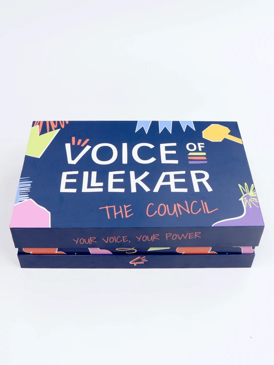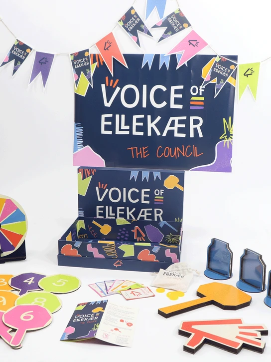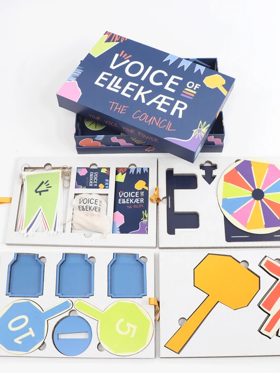 Voice of Ellekær empowers youth club kids to engage in fun, gamified decision-making. Pedagogues offer two options, with room for kids to propose a third. Tools include role cards, a gavel, a megaphone, decision tokens, a result board, flags, and banners, making decision-making accessible, visual, and engaging within a supportive and flexible framework.