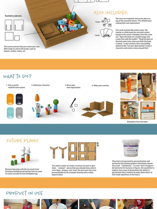 A toolkit for children to act out their story and create their own scenery & characters. The toolkit would contain modular and reusable pieces that the children can use to make different types of characters and scenery and combine them with arts & crafts supplies. It will also have cards to give the user a challenge and extra importance to the books.