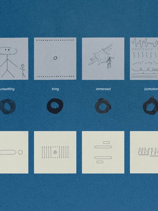 At the end of the screening, viewers are asked to think of a single word and color to describe their impressions. They are also invited to draw something that would represent their perception of the movie, what they felt.