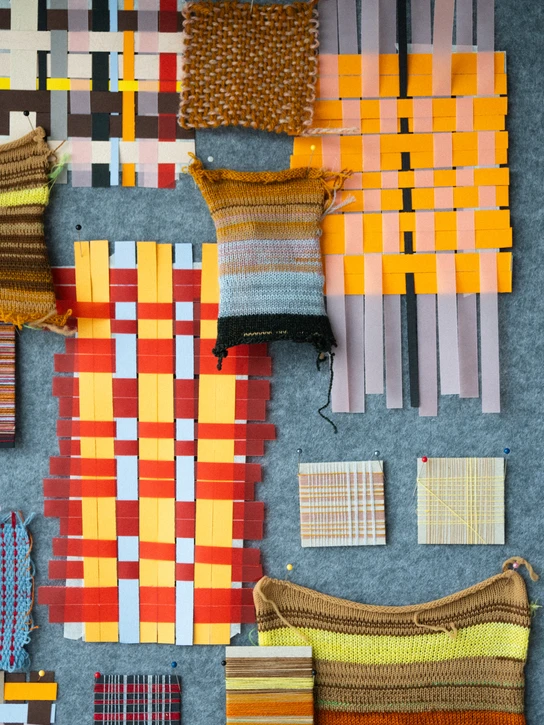 The first year subjects focus on basic skills such as drawing, composition and application of colours. You will learn the basic techniques and methods, and an essential part of the training is learning to master both analogue and digital tools within the areas of knitting, weaving and printing. You will work with pattern development and surfaces, where composition, colours and material inform your design, e.g. through sketching directly in the materials.