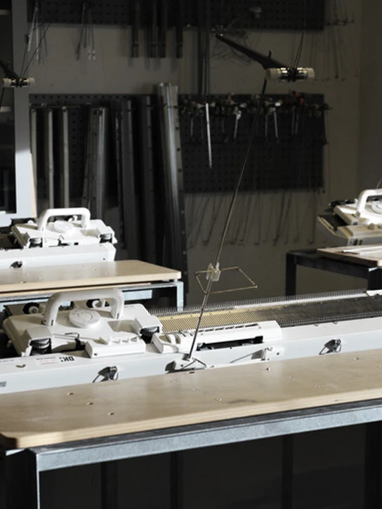 The Knit Studio has access to a large stock of yarn from all over the world and thus gives you the best conditions for researching and experimenting with different types of materials. The studio is equipped with analogue Silverreed machines and industrial flat knitting machines with varying gauge, as well as two digital Stoll knitting machines, CMS 303 and 530 with associated M1plus for programming. There is also access to a jersey overlocker, as well as a kettle machine for finishing shaped knitted elements.