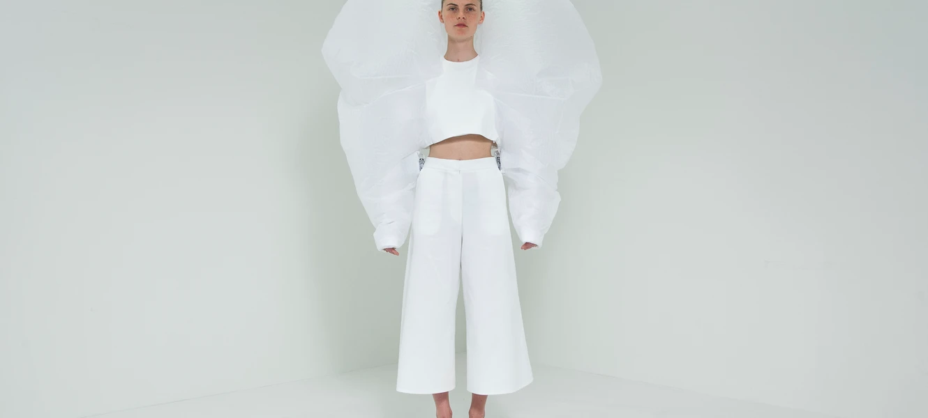IN BETWEEN lyder den sigende titel på Marie Sloth Rousings kollektion, der udforsker området imellem tøjet og rummet.