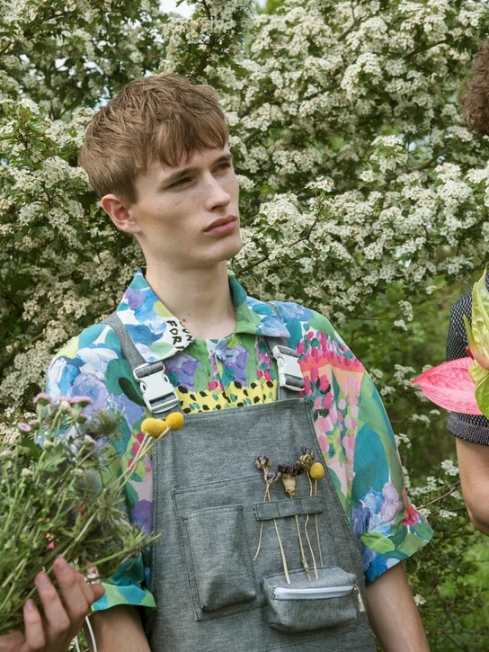With her playful and humorous approach, consisting of seven silhouettes, she breaks down the stereotype that flowers are a women’s prerogative . She does it, mind you, without compromising the masculine expression that remains intact in the form of references to traditional work clothes characterised by multiple pockets.