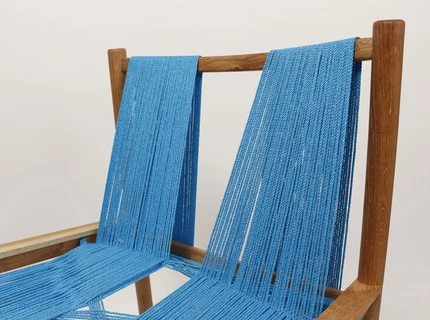WHAT? Are you sitting comfortably? The designer has created a guaranteed comfortable armchair – guaranteed because the legs are of different length and can thus be adjusted to exactly the height that suits the user's own height – long or short. With its oak frame and tightly woven cotton, aesthetics are taken care of as well.