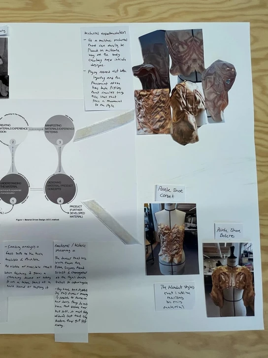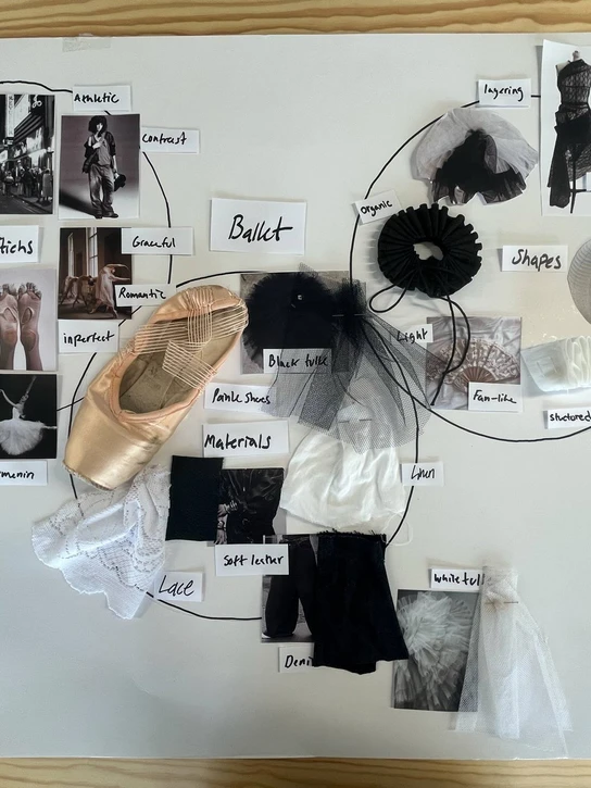 This bachelor project merges ballet and contemporary fashion through five spring/summer womenswear outfits. Focusing on sustainability, aesthetics and movement. Repurposing of pointe shoes, tutus and discarded secondhand materials. Exploring material-driven design, aiming to inspire the fashion industry to embrace redesign. Reflecting on how working with discarded materials shapes the creative process within constraints.