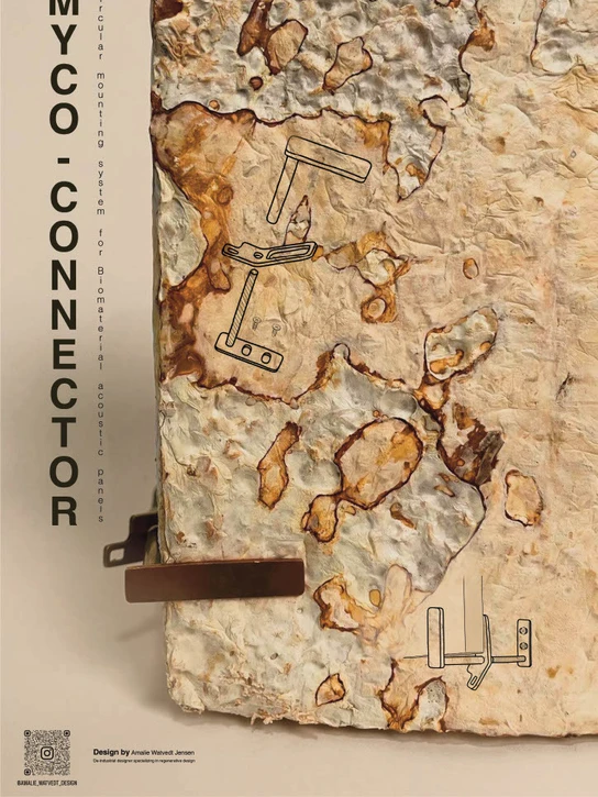 The project focuses on developing a mounting system for mycelium acoustic panels. Mycelium Composites are a lightweight, fire-resistant, insulating, and home-compostable material with good sound insulating properties.