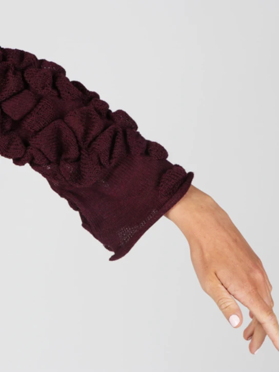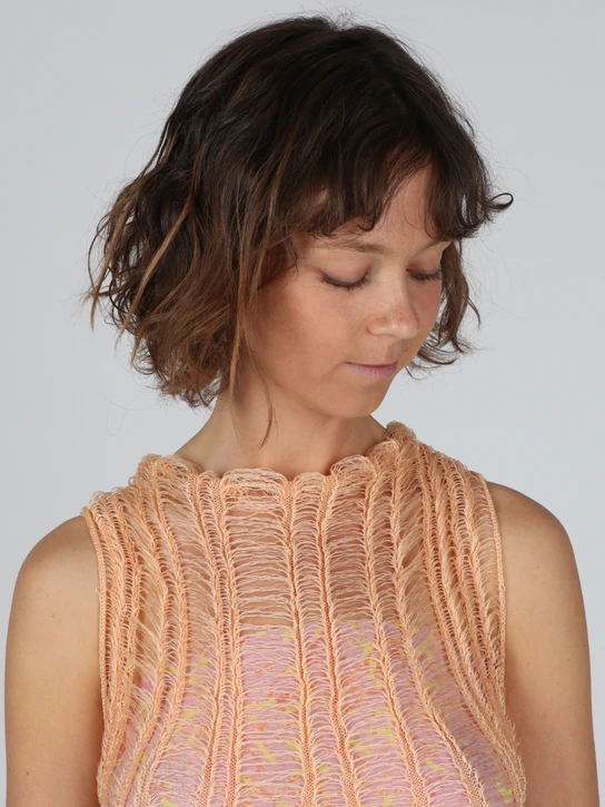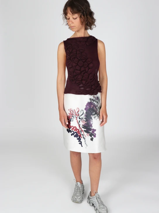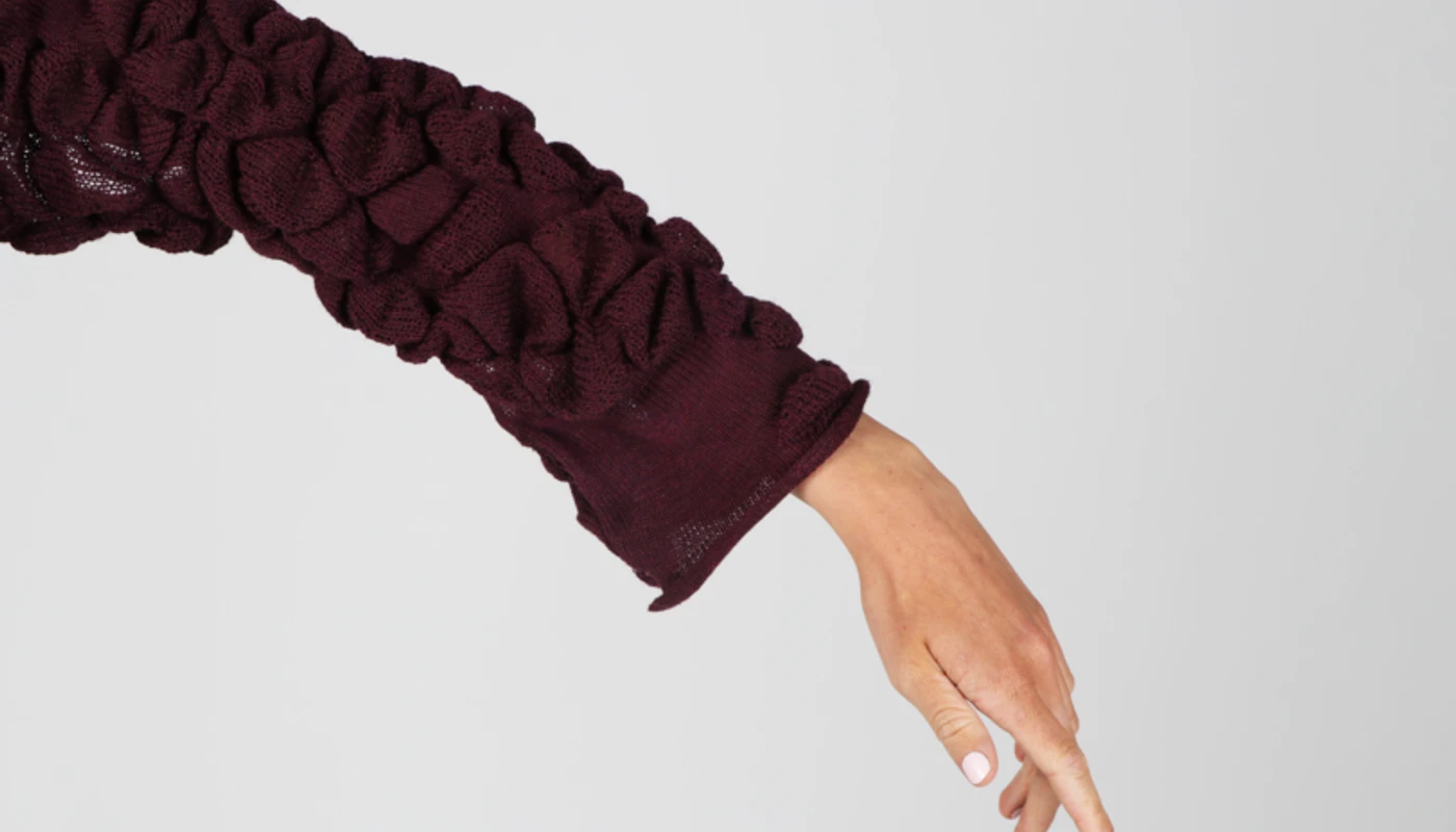 In a process of knitting and painting intuitively to the notes of Beethoven’s 32 Variations in pianist Elisabeth Holmegaard Nielsen’s musical interpretation, she creates enduring fashion, as sustainability is also about fascinating textiles that the user forms an emotional attachment to.