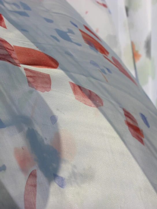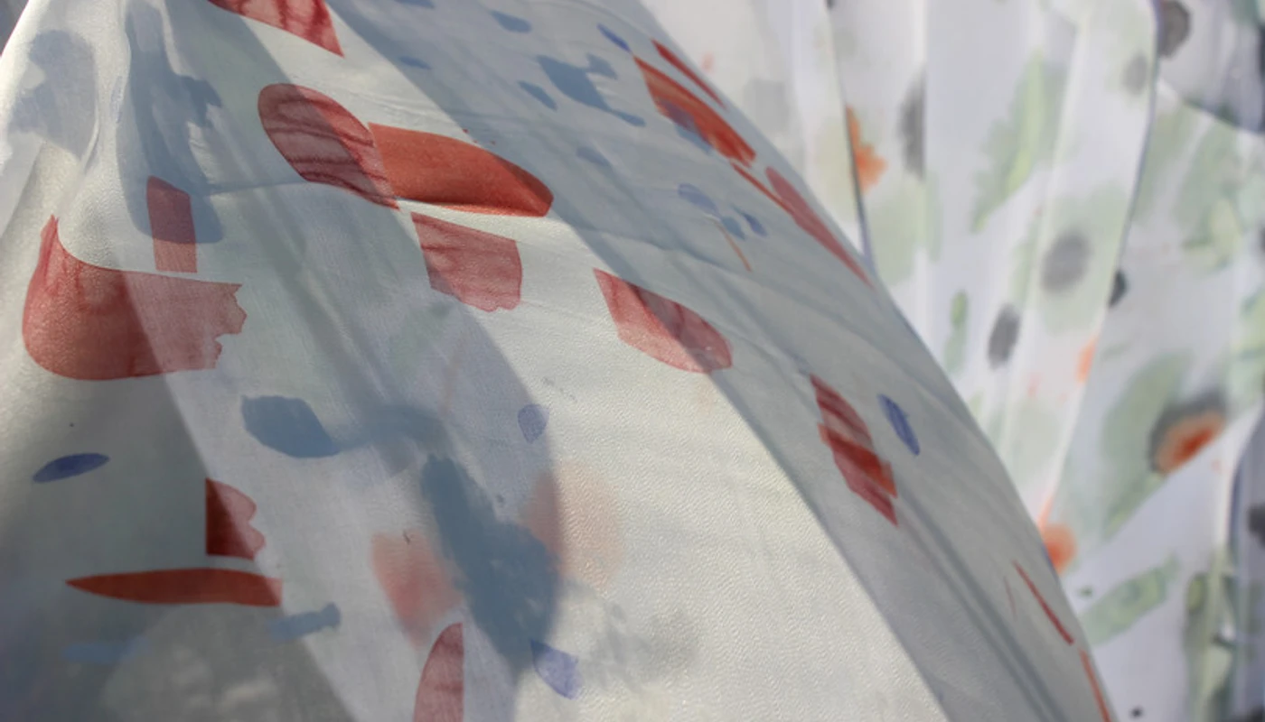 Nicoline Sandø Anderson har testet varierede trykteknikker til at udtrykke atmosfæren gennem tekstilet. Hun har malet mønstre i frihånd, brugt rammetryk og digitalprint.