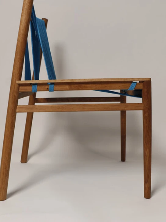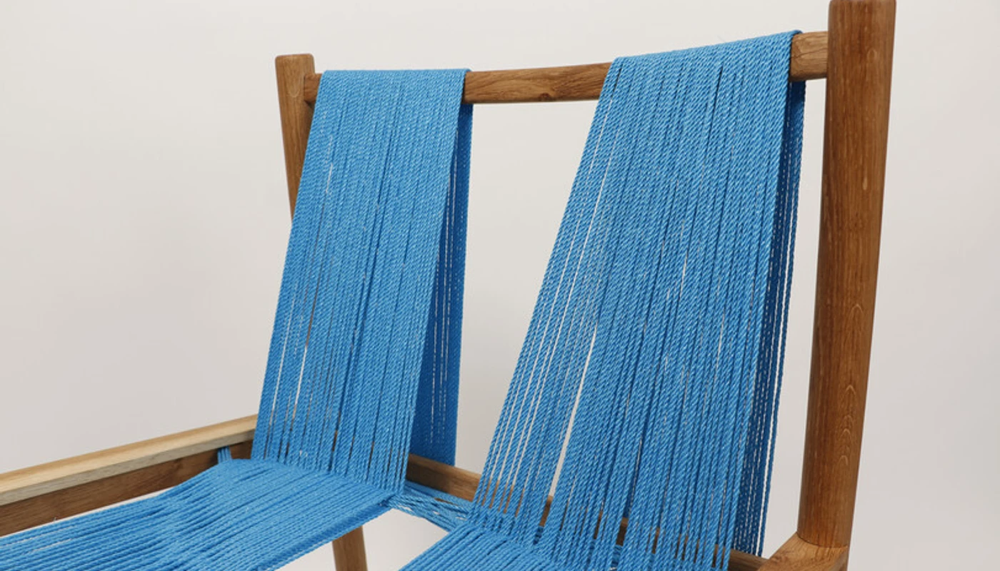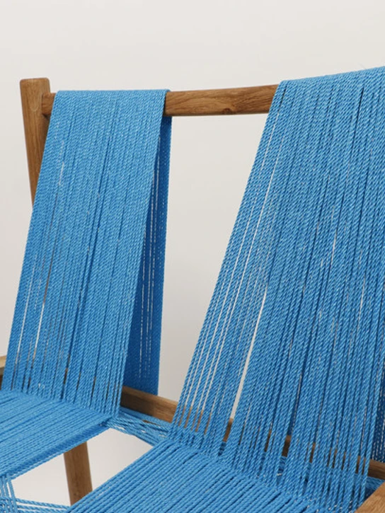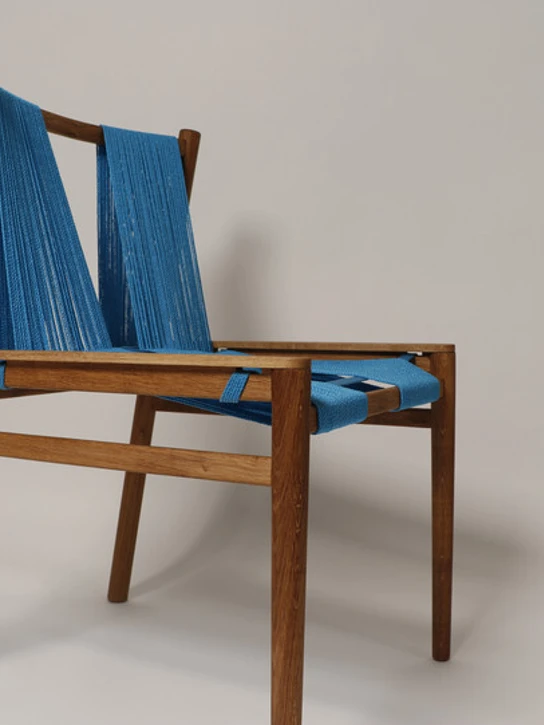 HOW? The chair is constructed of wood and blue nylon cords that bring to mind fishermen's blue nets - those same nets that in the sea are death traps for life below the surface, but which here reappear in aesthetic form for the benefit of the user of the chair.