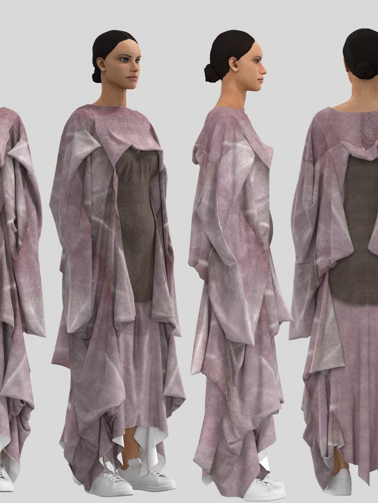 The process involves 3D modeling in Blender and garment prototyping in CLO-3D. The prints, also inspired by the shells, are designed to support and follow the shape of the garment. From a distance, they appear weathered and natural, but up close, they reveal pixelation, highlighting the hybrid world of Digitalized Nature.