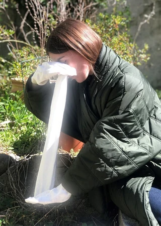 On a Monday afternoon in a courtyard garden in a small street of Aarhus a young woman was photographed. She was stretching the traces of love over distance and tapping into the smell of the precious present. The photograph was taken with the consent of polite distance and restrained senses for both the Lemon Balm and the young woman, to convey the invisible sensitive but still powerful love of the sense of smell between the two species with the artefact named “Sensformer”.”