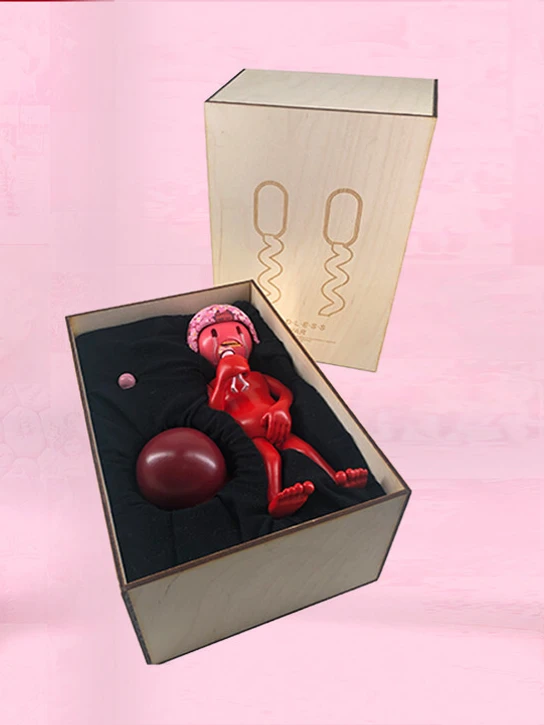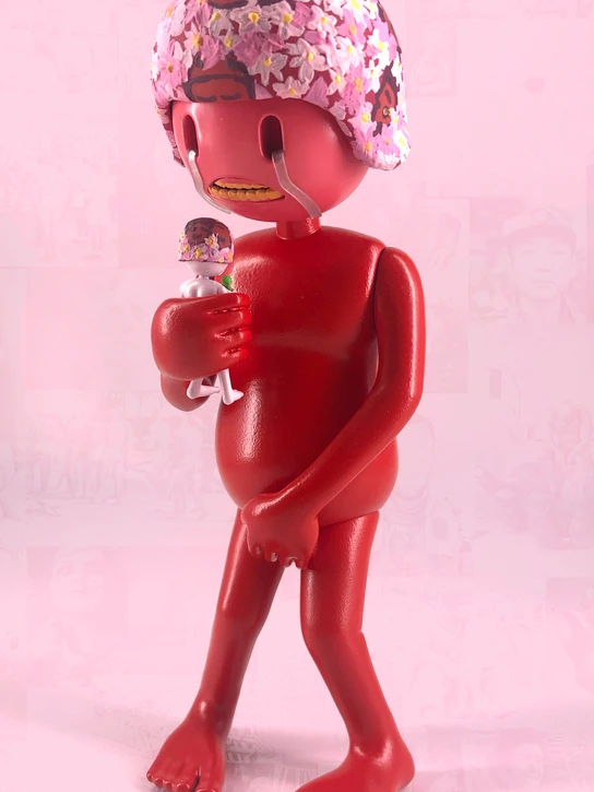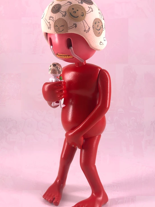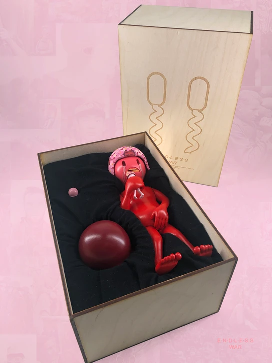 The design expresses the cruel nature of war through a way of cannibalizing between soldiers, and at the same time expresses the endless sorrow of war through the endless gnawing cycle. The 58 chrysanthemums on the printed helmet are used to commemorate the 58 Palestinian children killed in the Palestine-Israeli conflict in 2021.