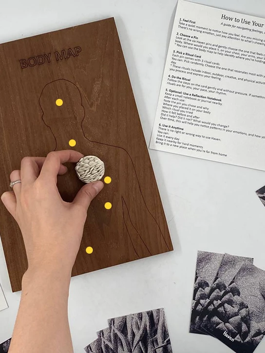 Identify where you feel discomfort; Choose the matching pin; Pick a ritual card to respond to that emotion; (Optional) Reflect in the notebook.