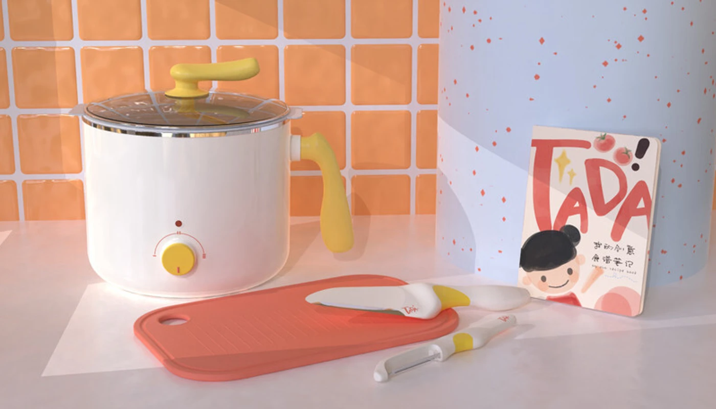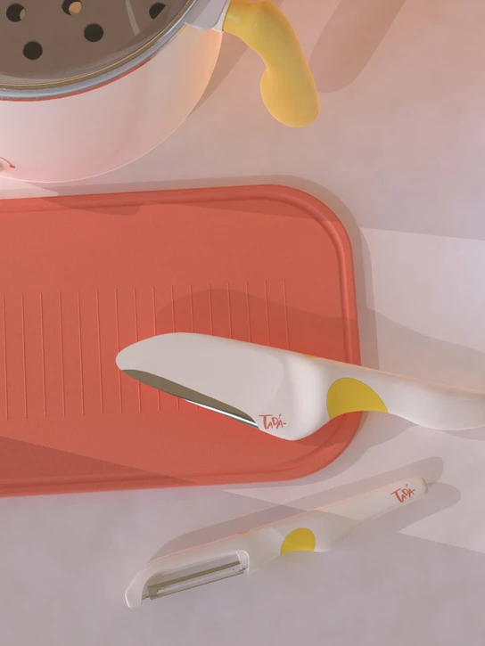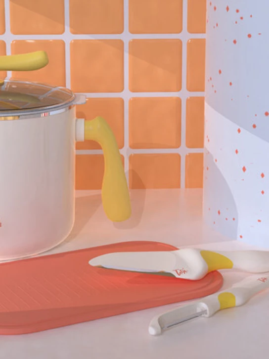 Knives are a major source of danger in the kitchen. Jielin redesigned the kitchen knives and paring knives to make them more child-friendly. They have a rounded shape without sharp edges, added colour blocks to show children the correct way to hold the knives so kids won’t be hurt by the wrong way to use them. Jielin also reduced the metal area to make them softer in appearance. The accompanying chopping board has a sink and a non-slip strip.