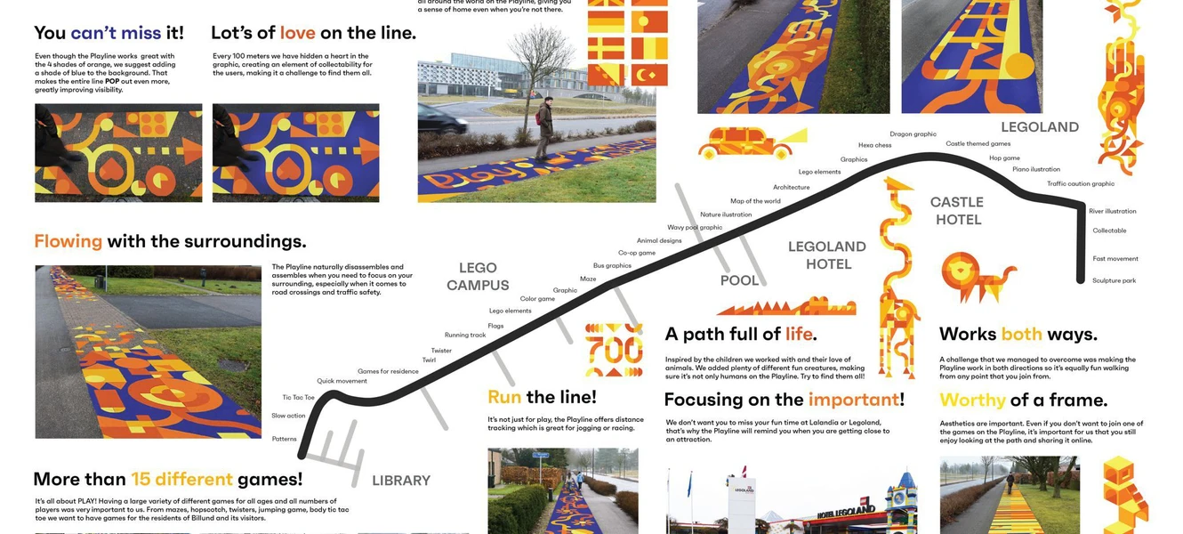 With the insights from the children, one group of students created designs for the “Playline” for the municipality of Billund, also referred to as the Children’s Capital. The Playline is a playful route that connects the tourist attractions in the east of Billund and the city center in the west of Billund. The aim of the Playline is to create a clear, safe and playful route around Billund, for everyone to enjoy and interact with.