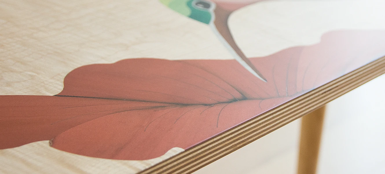 Til Snedkernes Efterårsudstilling har Camilla lavet en bænk – sirligt udsmykket med en blomst og en kolibri – et motiv hun har overført fra et ældre tekstiltryk. - Bænkens motiv er inspireret af dansk stoftryk fra 1940’erne. Her er tekstiltrykket omsat til et nutidigt udtryk og udført i det traditionsrige kunsthåndværk intarsia, der ligesom håndproduceret tekstilkunst kræver stor præcision, fortæller Camilla Skøtt Christiannsen.