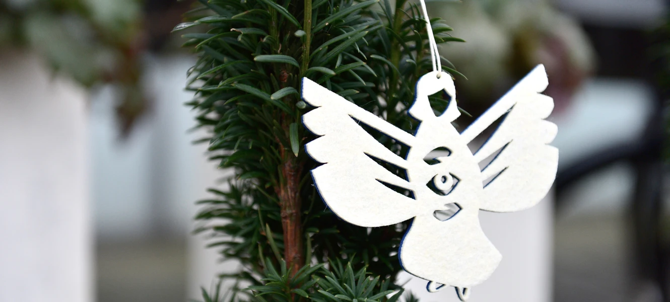 Englen er lavet i filt med en dyb blå farve på den ene side og en naturhvid på den anden, og farvevalget er helt bevidst.