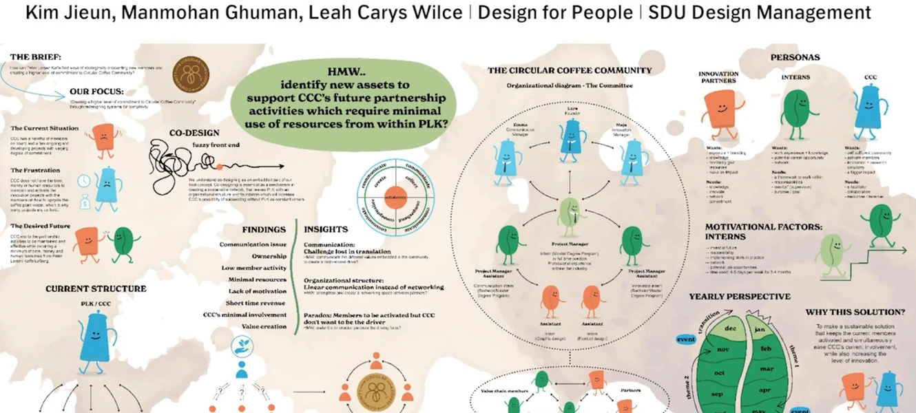 De studerende fra vores MA Design for People-uddannelse og SDU Design Management samarbejdede med Peter Larsen Kaffe og fandt svar på spørgsmålet "Hvordan kan Peter Larsen Kaffe finde måder til strategisk onboarding af nye medlemmer og skabe et højere niveau af engagement i Circular Coffee Community?" De studerende kom med interessante designløsninger, såsom en co-designet systemramme, hvor de forestiller sig praktikanter som hjertet af organisationen og drivkraften, der forbinder viden, design og innovation på tværs af fællesskabets partnere. Projekt af Eleonora Falqui, Troels Torp, Kadja Hansen, Kim Jieun, Manmohan Ghuman og Leah Carys Wilce.