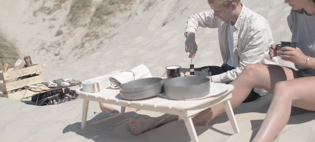 ”Jeg har designet en serie udstyr, der understøtter de fleste outdoor-aktiviteter: et grillsæt, et campingsæt og et finere madlavningssæt. Objekter, der tillader almindelige mennesker at tage på opdagelse i naturen. Objekter, der fungerer som guidelines, ikke som regler. De er skabt til en weekendtur eller et par dages hiking, så de størrelsesmæssigt passer til en lille oppakning. Og foldebordet kan du også tage med ned i parken, hvis du bor i en større by.”