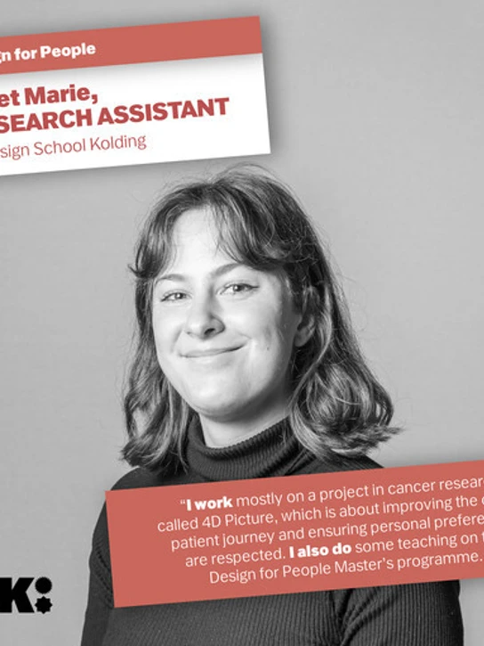 I work at Kolding School of Design as a Research Assistant. I work mostly on a project in cancer research called 4D Picture, which is about improving the cancer patient journey and ensuring personal preferences are respected. I also do some teaching on the Design for People Master’s programme.