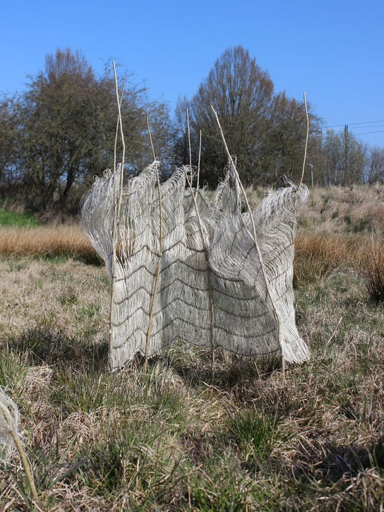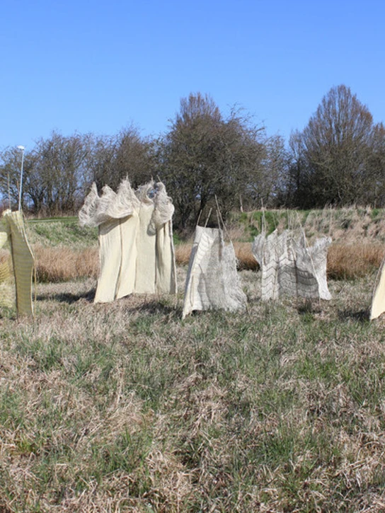Derfor har Marianne Nielsen sammen med Beck & Kinch designet et tekstilt rum under titlen ’Omfavnende Forgængelig Privatsfære'. Rummet er en lille privatsfære til individet midt i naturen og fællesskabet, og det håndskabte tekstil er konstrueret af naturlige fibre, som kan forgå naturligt.