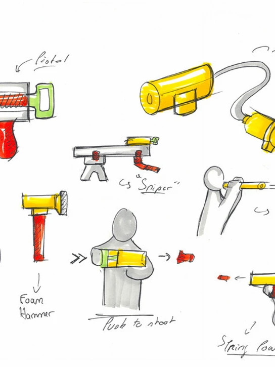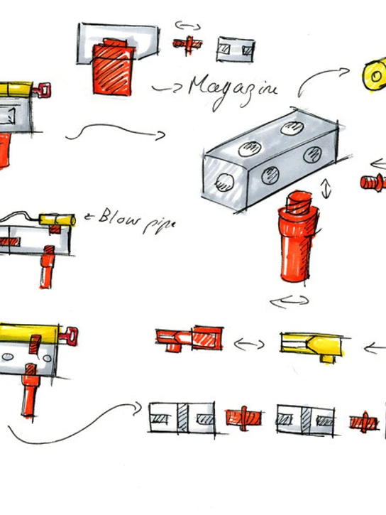 Børn og våben hører ikke sammen! Eller gør de...? Designeren ønsker at udfordre de tabuer, der gør, at vi som voksne reagerer mod børns krigslege. Tværtimod mener han, at legene med ’skydefingre’ og legetøjspistoler er godt for børnenes motorik og selvtillid, og at de lærer at håndterer aggressioner på en sjov og legende måde.