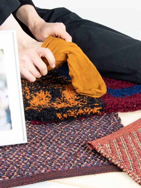 Tæpper på cirkulær rejse. Gamle cykelslanger. Jeans slidt i laser. Overskudsgarn fra den danske tæppeindustri og recirkuleret nylon af fiskenet.