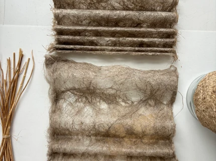 The process involves 3D modeling in Blender and garment prototyping in CLO-3D. The prints, also inspired by the shells, are designed to support and follow the shape of the garment. From a distance, they appear weathered and natural, but up close, they reveal pixelation, highlighting the hybrid world of Digitalized Nature.